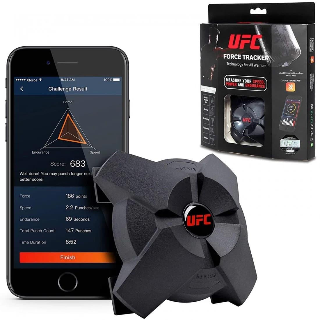 Датчик UFC Force Tracker розташовується зверху або знизу мішка, вимірює силу ударів руками і ногами, а також швидкість і витривалість і бездротовим чином підключається до вашого смартфону або планшету через Bluetooth, де в додатку XFORCE App ви бачите показники.